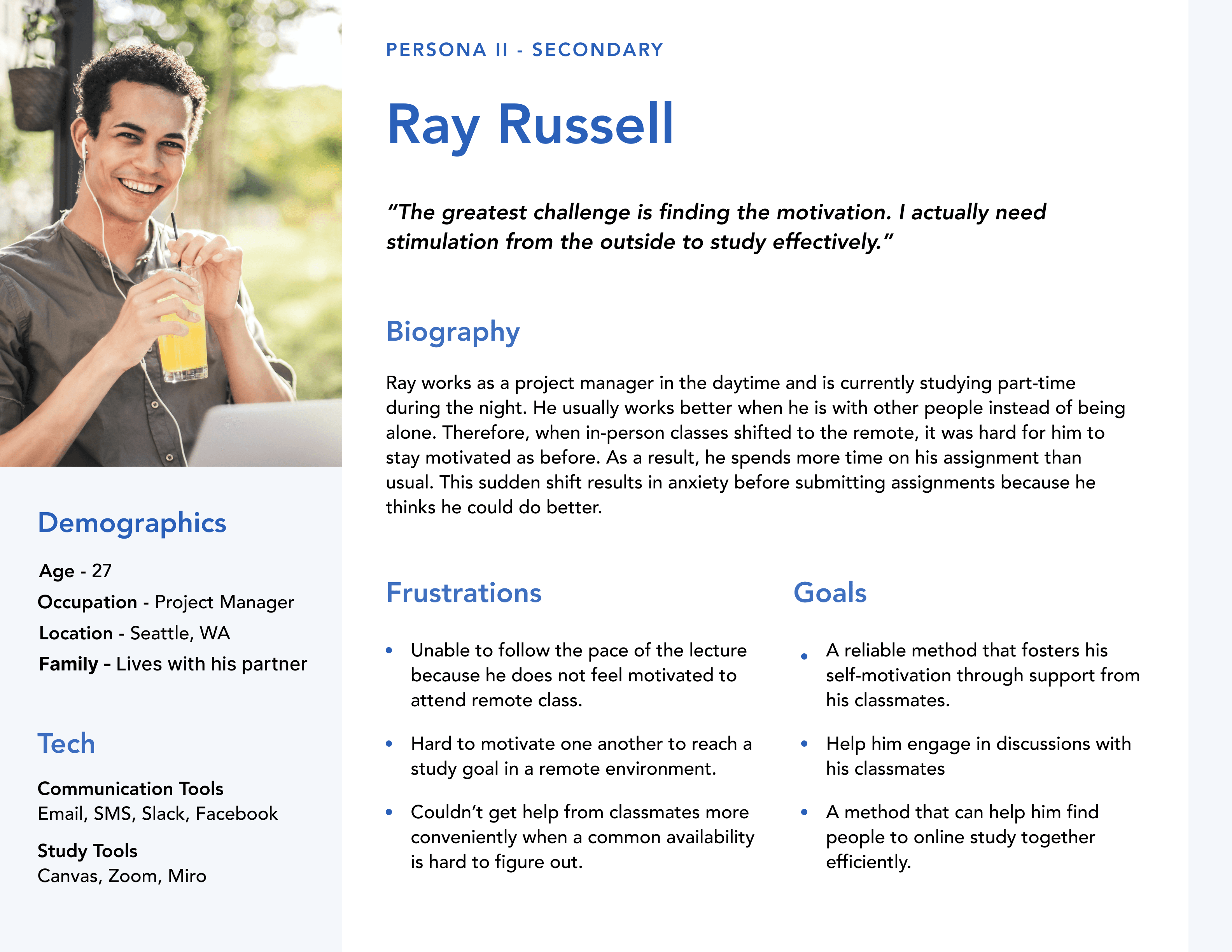 To understand user needs, I interviewed some people, used a keyword research tool to see users' preferences and read past research work. It helped us learn existing information about challenges in remote learning and understand the importance of collaborative learning environments for college students.