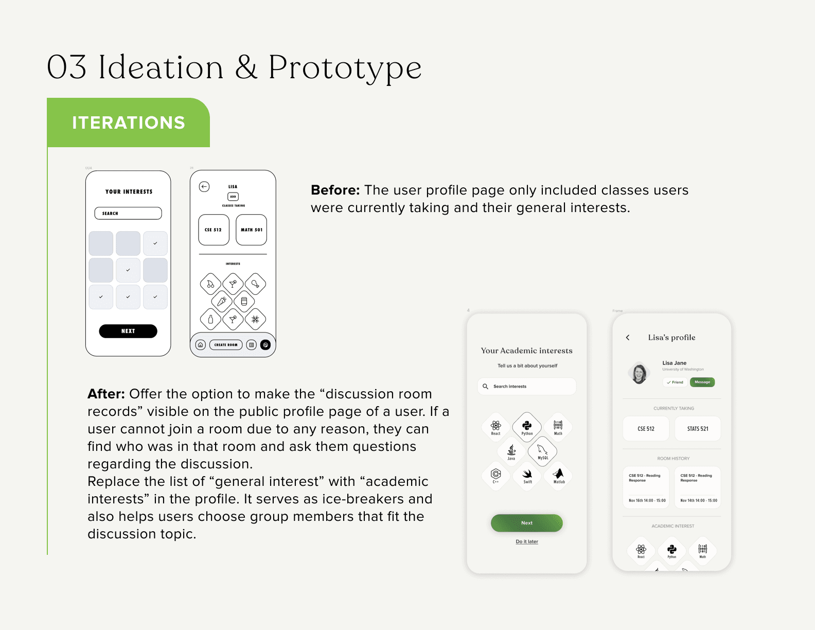 In this stage, my team and I conducted focus group interviews along with 1:1 interviews and learned more about users' needs. As a moderator in the focus group session, this is a good opportunity for me to share our design with the UW community and talk to them about.