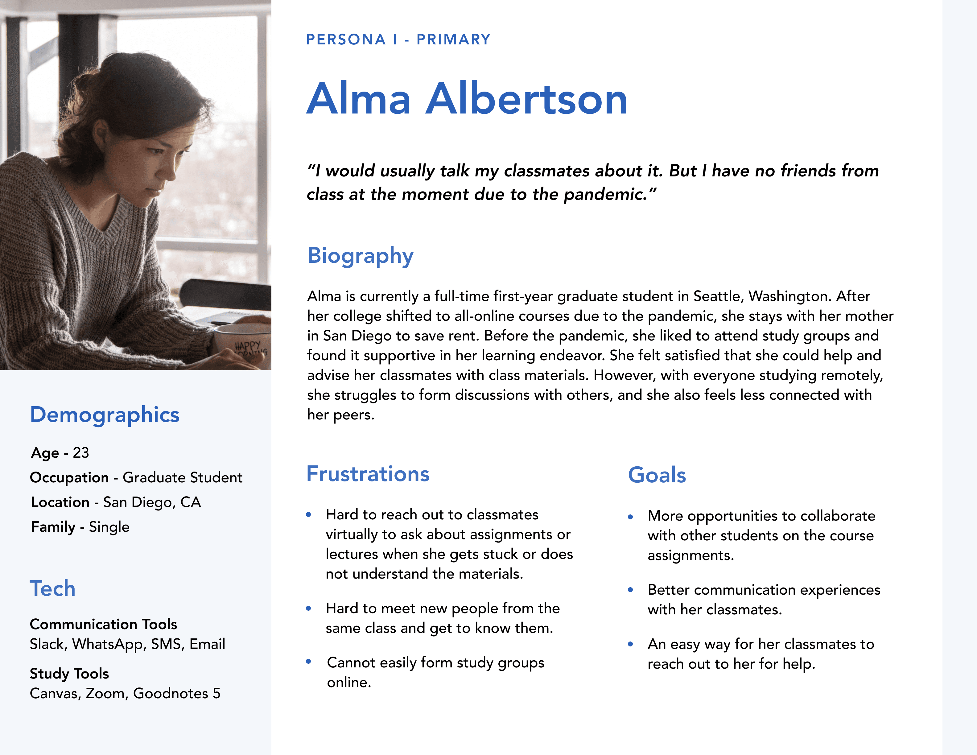Based on the 1:1 interviews with 6 people who are currently FT master students and adopt the virtual learning environment. We basically divide them into 2 groups: students who want to have better communication with their teammates and more social interaction with their classmates, and students who want to have support from other students to help them feel motivated to learn remote.