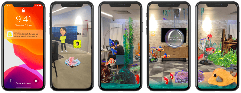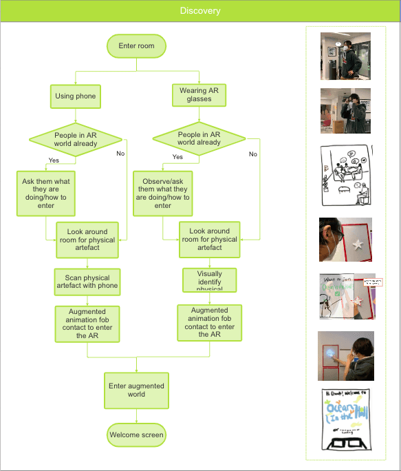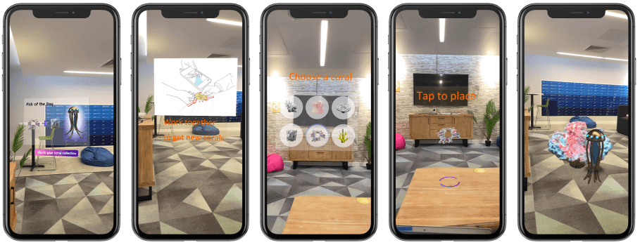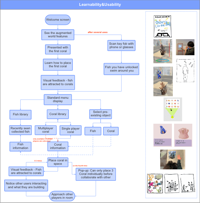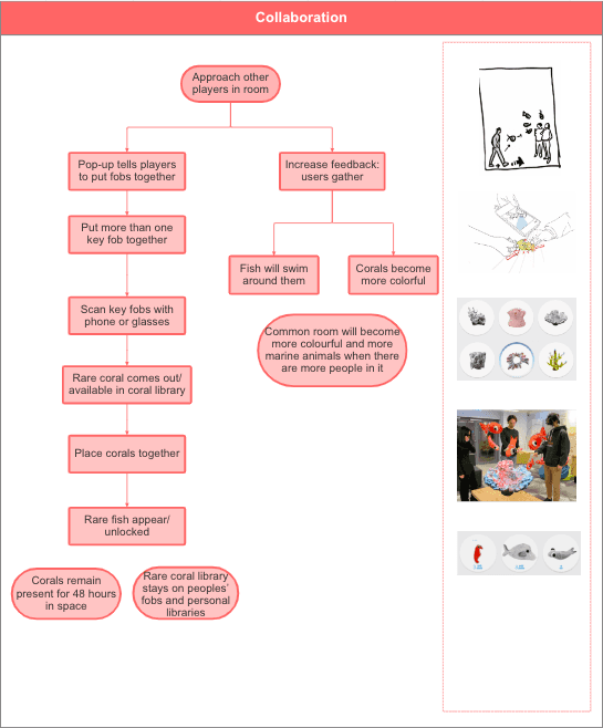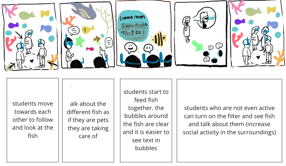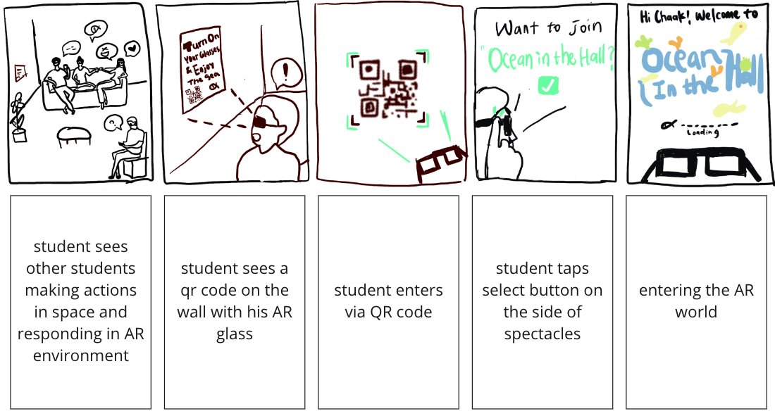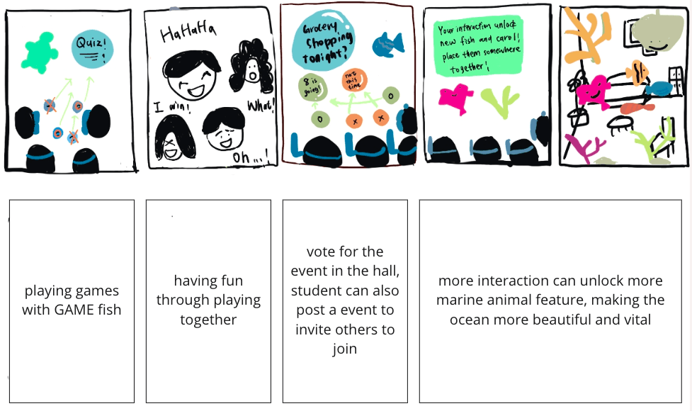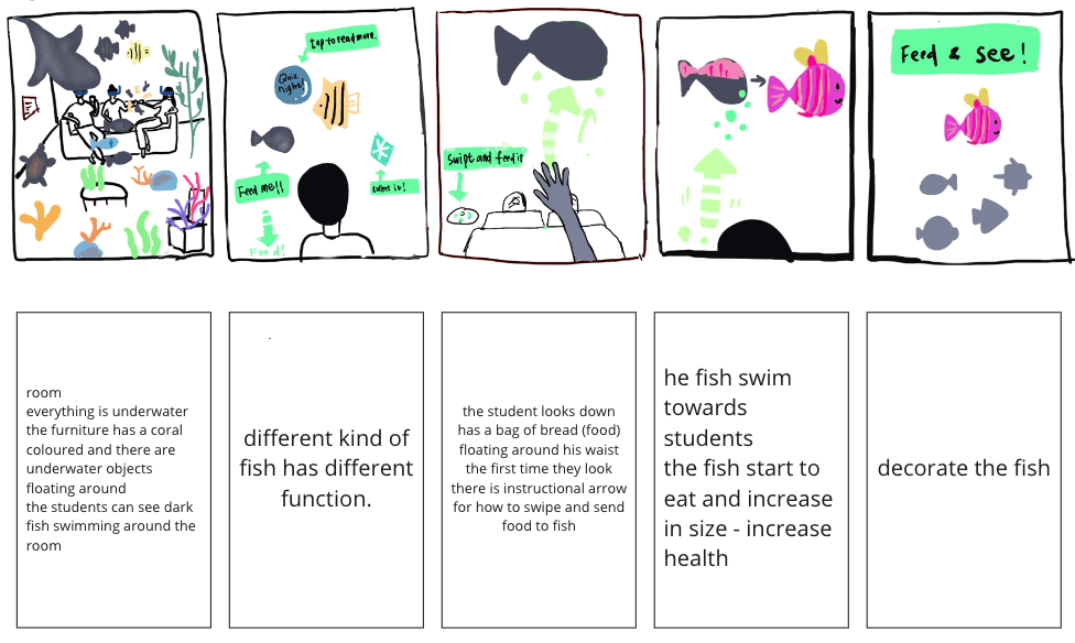We created several story boards to sketch out the interactions that can happened within the common room with AR technology, and figure out the mechanism that can lead a playful experience that brings students residents together. An idea of student building underwater world with corals and fish while collaborating with each other was chosen to be our key interaction and we wanted to further test this idea.