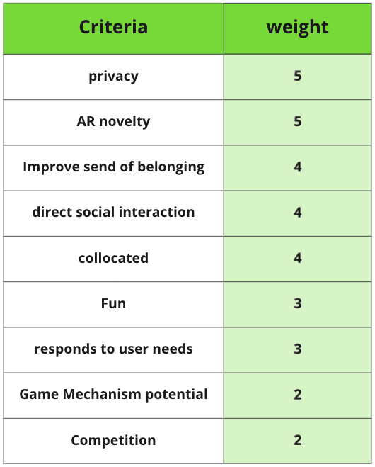 We created a list of criteria to examined our ideas in order to find the most suitable ideas and move to developing phase. After four rounds of examination, the spotlights goes to the idea of virtual pet in the common room and the virtual ocean building activities.