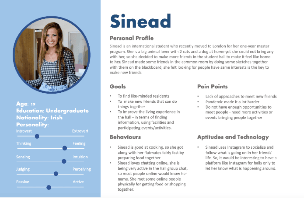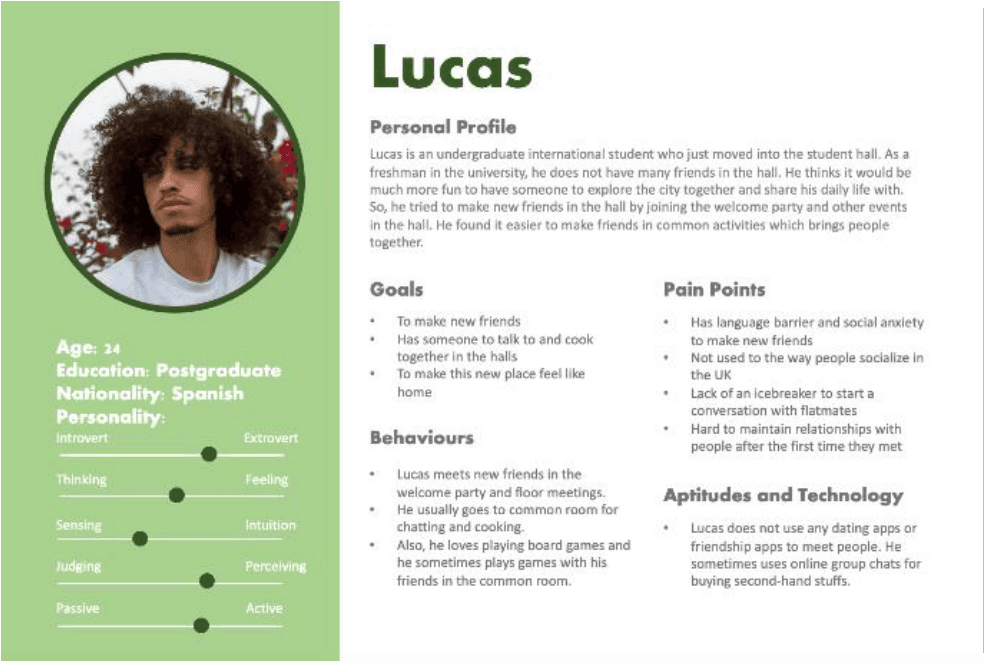 Lucas represents users that want to build a sense of belonging in the student accommodation. For example, making new friends and have someone to cook and share life in the dormitory together. Sinead is our secondary persona that focus on getting more information from the resident hall since she usually miss events and activities in the hall that provides opportunities to make new friends.