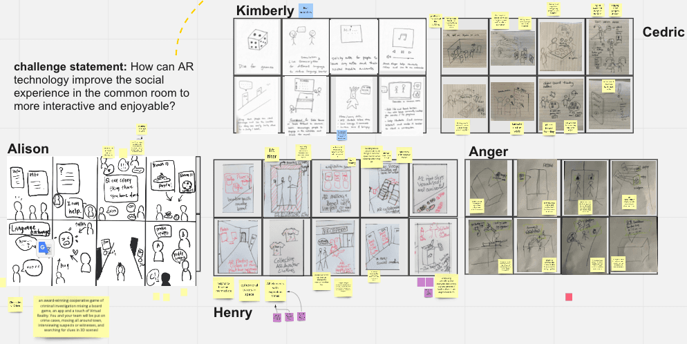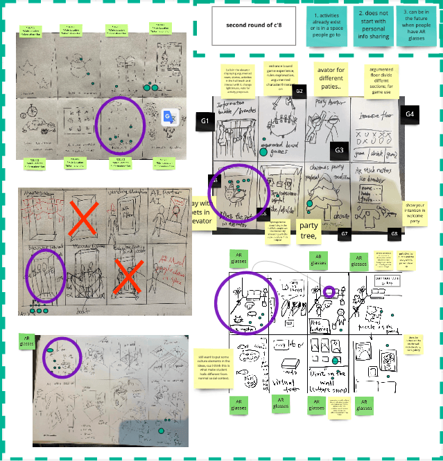 In order to explore the opportunity of design, we conducted first round of crazy 8 activities , trying to find out ideas that are more novel, and joyful with AR technology. After the discussions with team members, we found that if we want to deal with the information sharing pain point, we need to take the privacy issue into consideration. Therefore, we decided to focus on creating instant fun for user when interacting with other users and think about the potential to build a sense of belonging during these interactions.