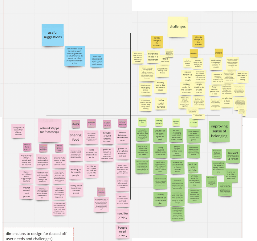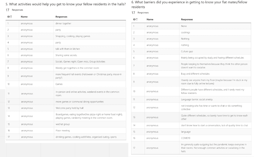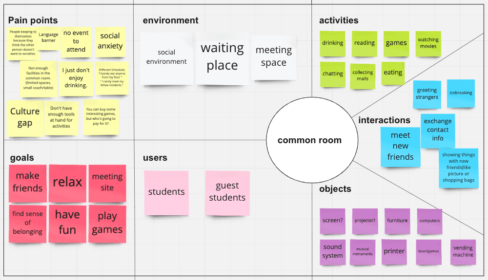 Since all of our team members live in student accommodations, we decided to do field observations in the common rooms in our own accommodation separately. We then shared our observations with each others and used an A.E.I.O.U Framework to analyse our finding. After the discussion, we decided to focus on activities, pain points and objectsWe drafted an online survey based on our observations and distributed it to students through the WhatsApp group chats within four student accommodations.