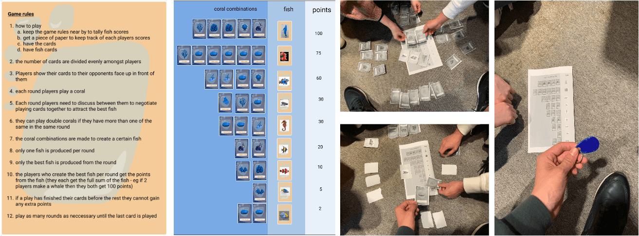 Our participants naturally start conversation with each other to talk about the strategies of pairing corals in order to get the fish they want, which is good that our goal for the game is to help users to start conversation without pressure. As the game design, we originally designed a points system, which users will get the corresponding points when they get a fish. However, we observed that the point system impeded users collaboration of collecting different fish to flourish marine animals collection, which was design to make users feel that they are in the same team and have the same goal in this game (sense of belonging).