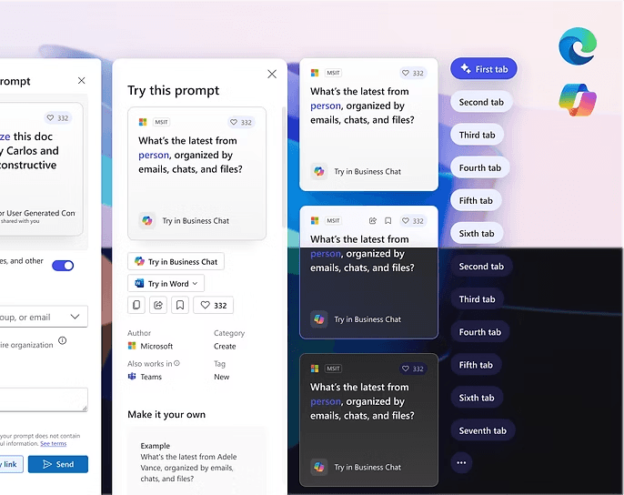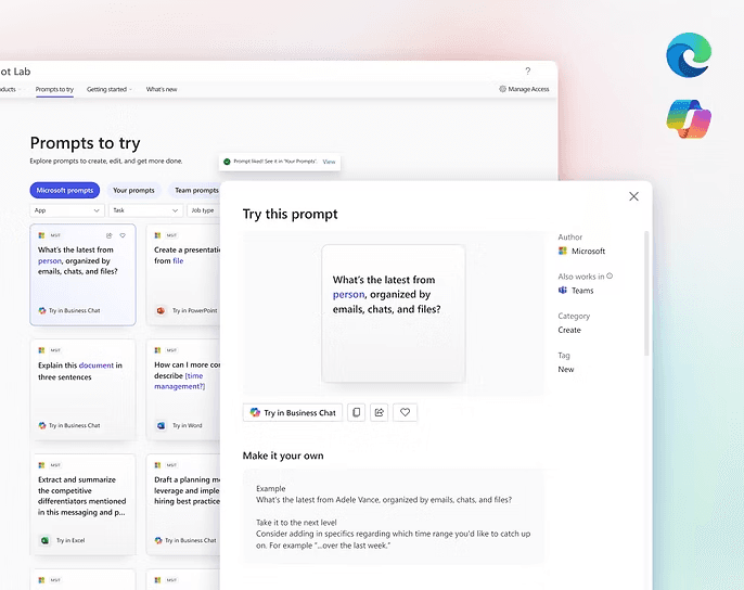 Refinement of the Copilot Prompt Gallery UX, enhancing filtering, detail pages/dialogs, and streamlining share/save flows for improved user experience.