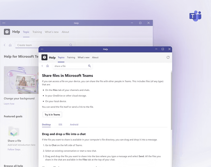 Explorations for the use of CTA throughout the Teams help and learning experience to enhance user engagement and streamline access to resources.