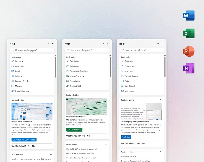 Iteration of the M365 Search and Help experience, improving search accuracy, accessibility, and integrating contextual help for a more intuitive user navigation across Microsoft 365 apps.